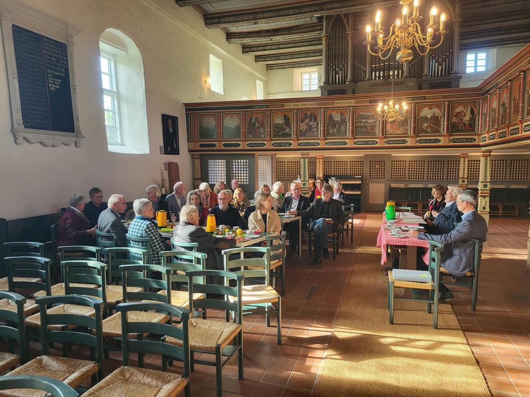 Am Sonntag feierte die Ludwig-Münstermann-Gesellschaft in der St.-Secundus-Kirche zu Schwei ihren jährlichen Festgottesdienst. Kreispfarrerin Christiane Geerken-Thomas begrüßte die fachliche Unterstützung durch das Netzwerk der Gesellschaft, da besonders den kleinen Gemeinden in der Wesermarsch nur geringe finanzielle und personelle Spielräume zur Verfügung stehen. Das Gemeindeleben vor Ort zu gestalten, ist bereits eine große Herausforderung, und dabei die Kunst im Blick zu behalten fällt nicht leicht. Pfarrerin Birgit Faß predigte über die Frage nach dem höchsten Gebot (Markus 12). Die Schweier Kanzel ist getragen von einer Moses-Figur Ludwig Münstermanns. Auf dem Fundament des alten Bundes mit allen Weisungen des Mose steht das Christusgeschehen und leben wir unseren Glauben bis heute. Meister Münstermann hat ihn mit lutherischem Akzent einzigartig in Szene gesetzt. „Was für ein Geschenk!“. In der anschließenden Jahresversammlung berichteten die Vorsitzenden Dr. Dietmar Ponert und Pfarrer Tom Brok von aktuellen Vorhaben und Entwicklungen. In 2022 wurde das „Internetportal für Wissenschaft und Reisende“ ans Netz gebracht. Die Ergänzung ikonographischer Details an der Schweier Kanzel (1618) wurde beratend begleitet. Die himmlische Begegnung zwischen der Musik J.P. Sweelincks und dem Münstermann-Altar in Hohenkirchen (1620) war „grenzüberschreitend“. Der Begleiter zu den Werken Münstermanns ist bei Isensee gedruckt erschienen. Die Bibliotheken Graf Anton Günthers und Pastor Rosas (Holle) kommen wissenschaftlich in den Blick. Die „Lange Nacht der Acht“ in den Butjadinger Kirchen brachte auch Ludwig Münstermann und seinen Gesellen Onno Dircksen auf die Bühne. Die Künstlerin Katrin Schöß aus Oldenburg zeigte erste kraftvolle Studien, die sie in der Vareler Schlosskirche von Werken Münstermanns gezeichnet hat. Die multifunktional nutzbare Schweier Kirche wurde schließlich zum Kino. Ibeling van Lessen zeigte den historischen Film „Zu Gottes Ehr und Zier“, den das Bundesfilmarchiv restauriert und dokumentiert hat. Annemarie Cornelius konnte berichten, dass die Gesellschaft am 29. Oktober 2023 in Tossens willkommen ist. Mit herzlichem Dank für die wunderbare Gastfreundschaft in Schwei ging eine themenreiche Versammlung zu Ende.