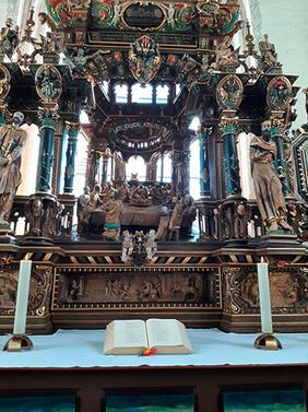 Im Sommer letzten Jahres „entdeckte“ die im Landesmuseum Oldenburg für die Alte Kunst zuständige Konservatorin Dr. Anna Heinze ein neues „Angebot“ zweier Münstermann-Cherubköpfe im Katalog eines Berliner Auktionshauses und setzte sich umgehend mit dem Vorsitzenden der Ludwig-Münstermann-Gesellschaft mit Wohnsitz in Berlin in Verbindung. Schnell war klar, dass die eher kleinen Engelsköpfe von den Sockel-Spangen der Hauptsäulen am Altar in Rodenkirchen stammen, von deren ursprünglich sechzehn nur vier „überlebt“ hatten. So konnte durch alsobald erfolgte Autopsie die Originalität der zierlichen ausdrucksvollen und recht gut erhaltenen Münstermann-Arbeiten festgestellt, der zugleich informierte und interessierte Kirchbauverein in Rodenkirchen motiviert werden, dieselben zu ersteigern. Das gelang sogar zum aufgerufenen Schätzpreis und die für uns so kostbaren Stücke sind nunmehr von professioneller Hand wieder an ihren angestammten Orten dem Altar eingefügt worden.