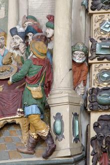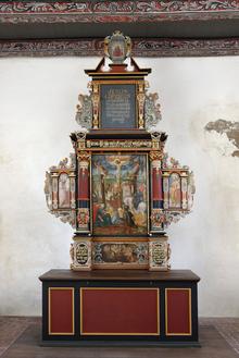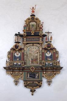 Desgleichen ist die Ikonographie ungewöhnlich vielfältig; sie ist sicherlich auf den Auftraggeber und sein tiefes theologischen Verständnis zurückzuführen und dem Bildhauer entsprechend vermittelt worden. Die Mitte des kunstvollen architektonischen Aufbaus wird beherrscht von einem Relief mit der Darstellung des letzten Passah-Mahles vor dem Auszug der Kinder Israels aus Ägypten – als ein alttestamentarisches Vorbild für das Abendmahl Jesu; dieser Bedeutung wegen erhebt sich darüber ein himmlisch anmutendes Phantasie-Gewölbe. Auf die geistige Teilhabe am Sakrament beziehen sich die lebensvollen Porträts des Vogtes und seiner Gemahlin in den seitlichen Nebenachsen, und darunter die noch lebenden Söhne und Töchter und die im unteren Abhang von Engelsputten gezeigten Särge der schon gestorbenen. Im vielfältig gestalteten Obergeschoß breiten sich die Motive des lutherischen Bildprogramms von “Gesetz und Gnade aus, um zuoberst vom (ergänzten) Auferstandenen als Symbol für das verheißene Ewige Leben bekrönt zu werden.