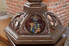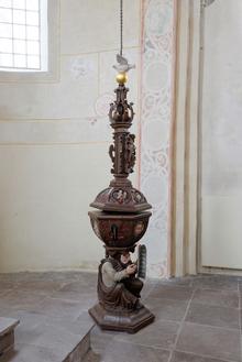 Das sechseckige halbkugelige Becken wird von einer hockende Figur des Moses mit den Gesetzestafeln getragen. Auf dem gewölbten Deckel erhebt sich ein mit Ornament-Spangen gezierter doppelstöckiger hoher Schaft, der unten die Skulpturen-Gruppe der Taufe Jesu durch Johannes den Täufer zeigt und zuoberst die fliegende Taube des Hl. Geistes über der goldenen Weltkugel. Auf den reliefierten Segmenten von Kuppa und Deckel sind Cherubköpfe, Tugenden, Stifterwappen und Datierung dargestellt.