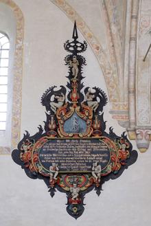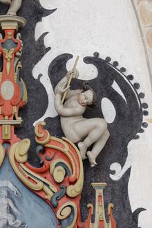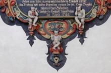 Zustand: Im Jahre 1978 wurden große Teile der originalen Fassung freigelegt, die Grundlage für eine entsprechende Neufassung waren. Die Farbgebung von 1644 zeigt einen Farbklang von Rot-Schwarz mit Ockergelb, wohl als Ersatz für Gold, und ein fast weißes Inkarnat bei den Putten; wichtig für die Wirkung auf der Wand und in den Raum hinein ist die zusätzliche Konturierung der Umrisse in Schwarz, welche die Rahmung nicht nur verstärkt, sondern noch durch zusätzlich erweiternde Ornamentierung bereichert. Die ebenfalls restaurierten gemalten Rahmen-Ornamente um die Fenster sind ein eindrückliches Beispiel für den sicherlich vielerorts ehemals sichtbaren gleichzeitigen Dekor, der alle Ausstattungsstücke des Kirchenraums stilistisch zusammenschloss.