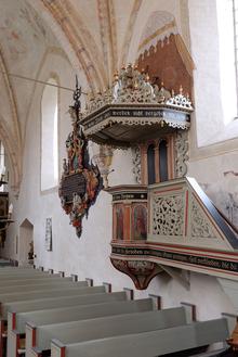 Zustand: Die auf 1583 datierte Kanzel ist mit Korpus, Schalldeckel und Rückwand erhalten und wurde laut Inschrift am Korb 1640 neu gefasst. Bei Errichtung des südlichen Erweiterungsbaues der Neuen Kirche wurde sie gegenüber wiederaufgestellt. Offenbar bei diesem Anlass wurde ein neuer Schalldeckel geschaffen, der den vorhandenen alten überdeckt und auf Grund der charakteristischen gesägten Ornamentik, mit der die Giebel- und Bogenspangen-Formen im Beschlagwerk-Stil gestaltet sind, Jacob Kröpelin zugeschrieben werden kann.