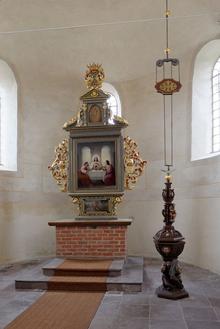 Zustand: Predella und Obergeschoß sind Teile des Altares von 1641. Für 1716 ist eine „Renovierung“ des Altars bezeugt, der vielleicht die Gemälde in beiden Teilen zugehören, zumindest aber die prächtigen Akanthus-Behänge des Hauptgeschosses; zugleich erfolgte eine neue Fassung des Ganzen. Das Hauptgeschoß wiederum wurde 1888 durch den Ausbau der originalen Holztafel mit einem Gemälde des Abendmahles und den Ersatz durch das vorhandene Ölgemälde mit der Darstellung der Emmaus-Szene von Paul Händler (1833 – 1903) erneut verändert. Bei der Restaurierung im Jahre 1978 wurde der farbige Zustand von 1716 wiederhergestellt.