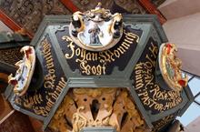 Vier Felder der sechseckigen Korpusbrüstung sind reich und vielfältig ornamentiert zu aufwendigen Bogennischen mit sphärischer Räumlichkeit gestaltet. Vor ihnen auf Konsolen stehen lebhaft agierend die Freiplastiken der Evangelisten. Auf einem schmaleren, zur Rückwand anschließenden Feld stand die verlorene Figur des Kirchenpatrons, des Hl. Dionysius. Auf den flachen Segmenten des Korbes reliefiert die Stifternamen mit ihren großen davor befestigten Wappen. Auf dem Kranzgesims des ausladenden Schalldeckels sind die Teile eines gesprengten Giebels befestigt: in der Mitte die hohe Figur des segnenden Salvators mit der Weltkugel, auf den seitlichen Schrägen die Liegefiguren von Pax (Friede) und Concordia (Eintracht).
