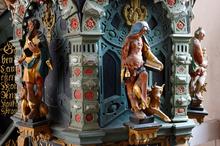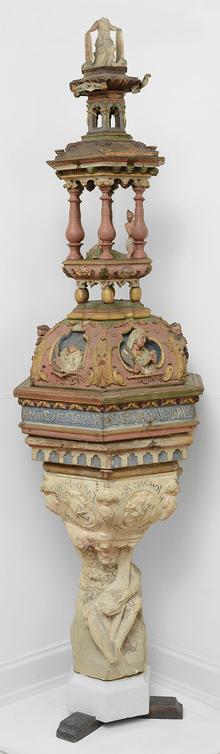 Material: Sandstein, Eichenholz (Einfassung des Beckenrandes und konstruktive Teile des Deckels), Lindenholz (Figuren)