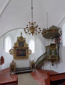 Zustand: Laut Inschrift am Tragebalken der Orgelempore wurden Altar, Kanzel, Priecheln und Taufe 1946 von Hermann Oetken „erneuert“; das bedeutet wohl eine Neubemalung. Nach einem Brand in der Kirche 1972 wurde der Altar vom Ruß gereinigt, dabei die Gesetzestafeln des Moses übermalt.