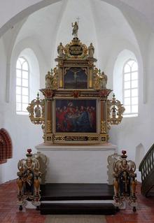 Die Vorderwangen der zugehörigen Abendmahlsbänke zeigen in Nischen, die von seitlichen Rollwerk-Balustern gerahmt und von übergroß beflügelten Cherubköpfen bekrönt werden, die reliefierten Figuren von Paulus mit Buch und Schwert (ergänzt) auf der Brotseite und Martin Luther mit Buch auf der Weinseite.