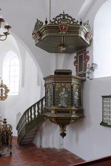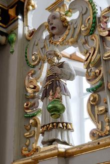 Zustand: 1946 wurde die Kanzel umgesetzt und neugefasst. Nach einem Brand in der Kirche 1972 erfolgte 1974 eine weitere Übermalung durch Jochen Seebach.