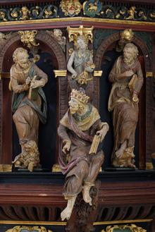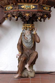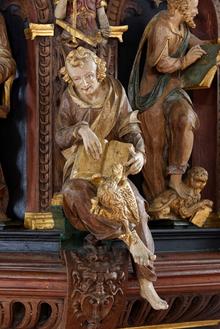 In den vier Bogennischen der sechseckigen Korpusbrüstung stehen Figuren der ersten drei Evangelisten zu Seiten des segnenden Salvators; letztere unlängst wieder in die durch Cherubköpfe in den Bogenzwickeln hervorgehobene Nische zurückversetzt. Die Ecken übergreifen die Hermen weiblicher Tugenden und vor ihnen bewegen sich über Voluten mit phantastischen Groteskmasken die Sitzfiguren des Königs David mit der Harfe, des Evangelisten Johannes in jugendlicher Schönheit mit der Schreibfeder über dem offenen Buch und seinem Adler, der ihm das Tintenfass bereithält, und des Königs Salomo mit einem Szepter.