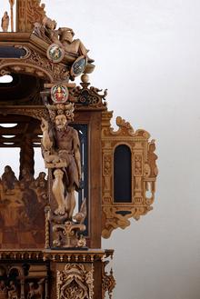 Auf der Predella befinden sich die Reliefs von Verkündigung, Anbetung der Hirten und Beschneidung Jesu. Auf den Risaliten stehen als Atlanten die Figuren des Moses mit den Gesetzes-Tafeln und Johannes des Täufers, der mit der Rechten auf den ehemals im Obergeschoß sichtbaren Kruzifixus verweist; beide sind Zitate des Bildprogramms von “Gesetz und Gnade”. Sie tragen eine Kuppel, die das Hauptgeschoß überwölbt und auf der das Obergeschoß mit der Kreuzigung sich erhob. Auf den Kuppel-Schrägen sind die Liegefiguren von Pax (Friede) und Concordia (Eintracht) erhalten.