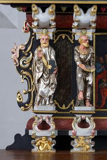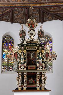 Auf dem Kranzgebälk des Hauptgeschosses erhebt sich ein sehr hoher und äußerst kunstvoll gegliederter Aufsatz, dessen Gebilde auf die Form eines gesprengten Giebels zurückzuführen ist. Eingefügt sind die Gemälde der Grablegung, der Auferstehung und Himmelfahrt Jesu; zuoberst auf einem Sockel die Figur Jesu als Guter Hirte mit dem wiedergefundenen Lamm auf den Schultern.