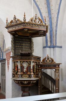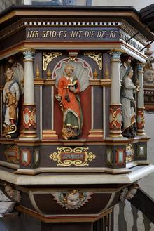 Kanzel mit Schalldeckel und Treppe mit Portal