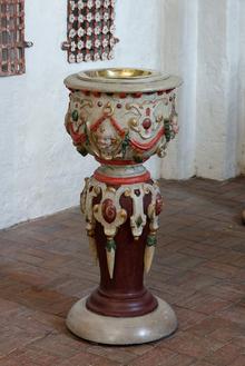 Zustand: Unter einer älteren Bemalung am Korbsegment unter dem Lucas-Feld der Brüstung wurde die Jahreszahl 1669 freigelegt, die sich wohl auf eine erste(?) farbige Fassung bezieht; dieselbe steht auch auf dem Fries des unteren Rahmens des Mittelschreines vom Altar, so dass angenommen werden kann, dass beide Prinzipalstücke gleichzeitig (neu) gefasst worden sind, vielleicht sogar zusammen mit dem Taufbecken und seinem Deckel.